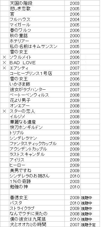 上から憶えている限りで視聴した順番で並べてみました。ドラマ名の右の数字はドラマの作成された年になります。そしてドラマ名の左にある「×」は途中で見るのをやめてしまったドラマです。けっこう見てきましたね~こうしてみると。とりあえず全話完視聴したドラマは総数37本になりました。これからもどんどん増えることでしょう(笑。