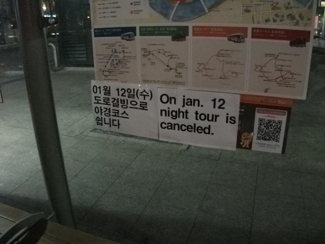 前回の旅行で乗ってみたらなかなか良かったので、今度は夜の便に乗ろうと、出発予定時刻の20時ちょい前に光化門のバス停に行ってみました。でもシティーバスなど止まっていないのでバス停前にある観光所の人に聞いてみたところバス停を指差して「あそこからでてますよ」と言われしばし待ってみました。ところが20時になってもバスは来ません…。自分達以外にインド人っぽい人もツアーバスを待っているっぽく、自分にツアーバスはここで間違えないのか聞いてきました。自分は「そうです」と答えました。そして寒い中さらに待つこと10分くらい(たぶん・・)。自分の肩をたたく先ほどのインド人らしき人物。なんだか張り紙を指差しています(インド人はおまえはここだというから待っていたがこの有様は何だって言う表状をしながら・・)。それが左上の画像。「1월 11일 야간코스 도로결빙으로 인하여 운행하지 않습니다.(1月11日夜間コース道路結氷によって運行しません。)」・・・!!!!。がっくりです。そしてまた次の日も光化門の飲食街でソルロンタンを食べて、カフェでコーヒーを飲み20時数分前にバス停に行ってみましたがまたしても(左下画像参照)・・・!!!!!。。何故1日目で凍結の為って書いてある(ソウルはその日は降雪があり気温もほぼ二桁零下です)のにまた次の日も乗ろうとしてるのか阿呆だと思いませんか?